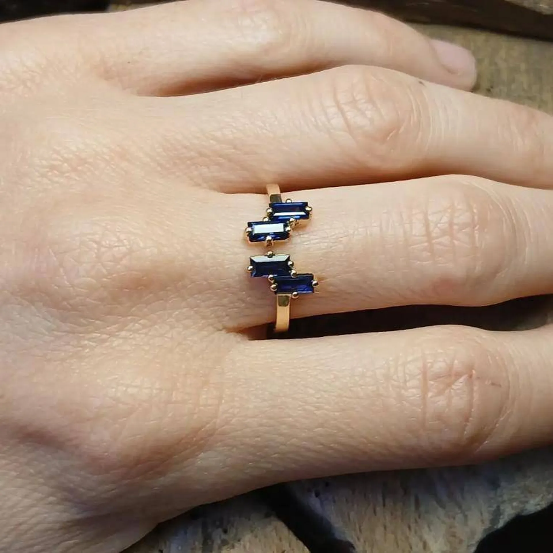 Une cliente est venue à mon atelier avec une bague en plaqué or qu'elle aimait beaucoup mais toute abimée. Elle m'a donc demandé de refaire la même avec des saphirs rectangle et en or jaune 18ct. Le résultat est super joli et les pierres de qualités.