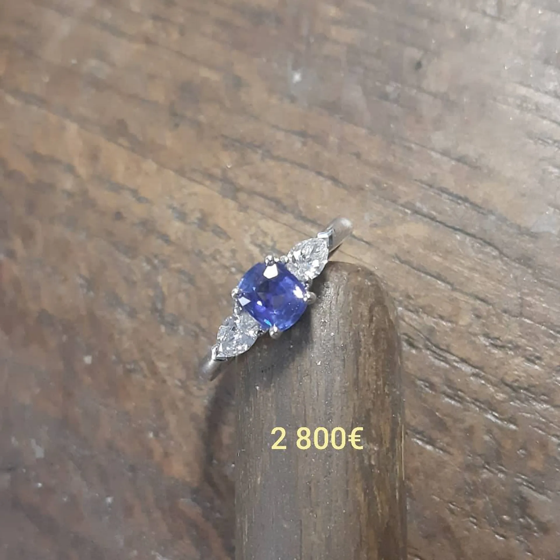 Bague or gris 18ct, saphir coussin et deux diamants poires:
